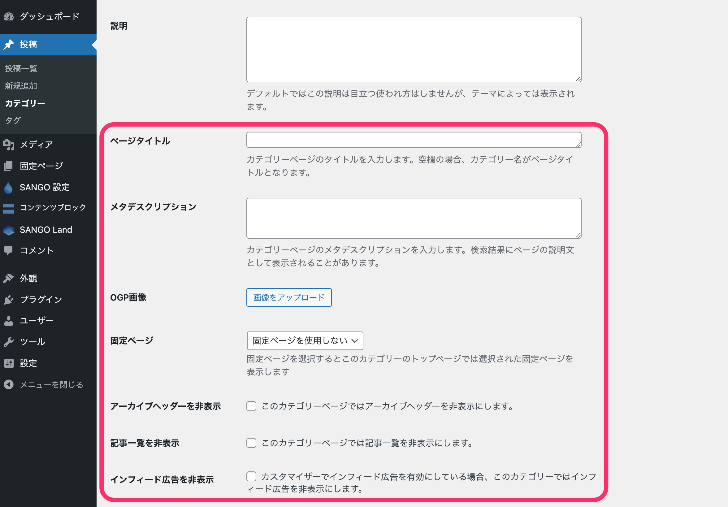 お世話になっております。 カテゴリー編集ページのSANGOの追加機能も便利で、活用させていただいています。 プラグインのCustom Post Type UIを使用して、新しくカテゴリ(タクソノミー)ページを追加しました。追加したカテゴリの編集ページでもSANGOの追加機能を使いたいと考えています。カテゴリートップページに固定ページの内容表示と、カテゴリページにOGP画像の追加を設定したいです。